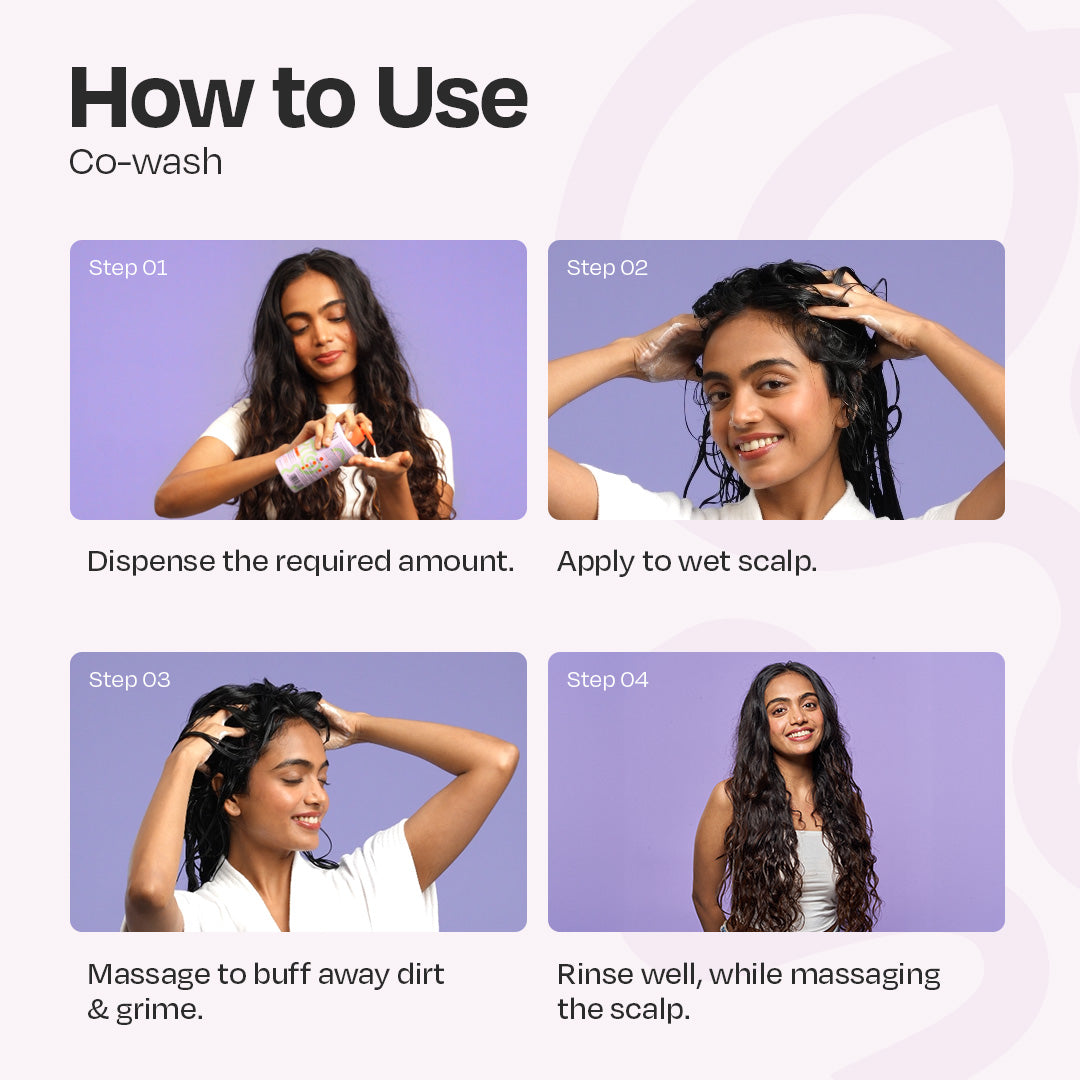 - EFFORTLESS APPLICATION: Apply our co-wash to wet hair and scalp. Massage, leave it on for 3 minutes, then rinse. Use once a week alongside your regular shampoo and conditioner. Avoid applying oil before co-washing.